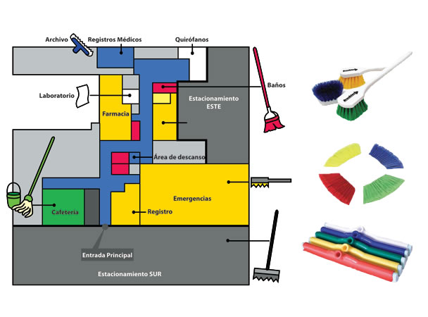 Separando el equipo, los materiales y los procedimientos para prevenir la contaminación e infección cruzada en cualquier área o lugar de trabajo. Así en el plan de limpieza y desinfección deberá determinar en cada zona de diferente riesgo el uso de un color específico. Por ejemplo: